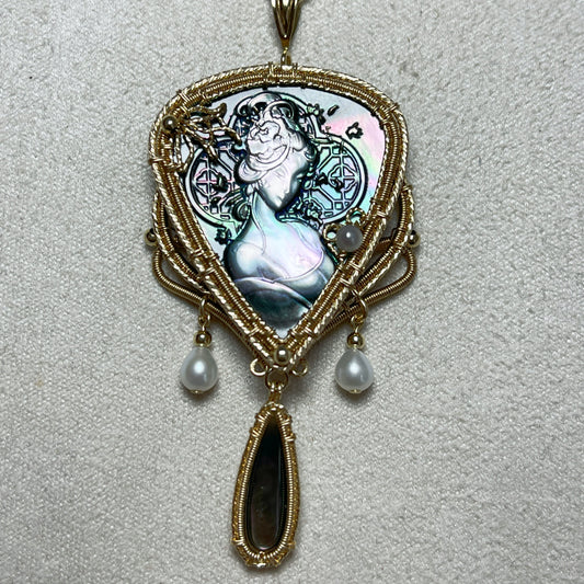 [Palm Leaf Fan ] Handmade Natural Black Mother-of-Pearl Cameo Necklace - Wire Wrapped Jewelry