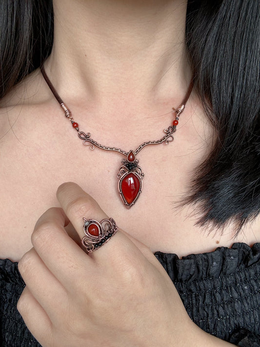 Handmade Garnet Necklace and Red Agate Ring - Jewelry Set