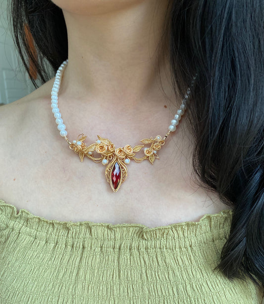 Handmade Classic Rose Garden Necklace - Wire Wrapped Jewelry with Fresh Water Pearl